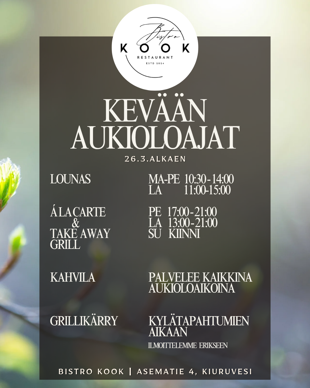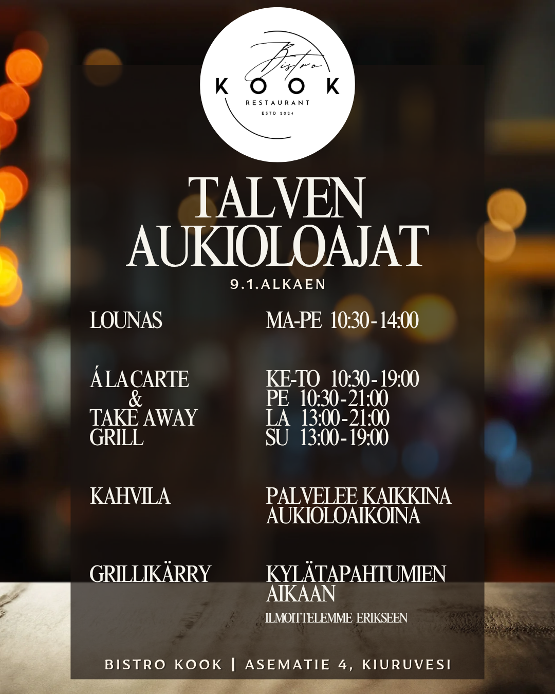 "Bistro Kook tarjoaa herkullisia lounas- ja Á la carte -annoksia Kiuruveden keskustassa, jotta asiakkaamme voivat nauttia maistuvista ruokaelämyksistä arjen keskellä."