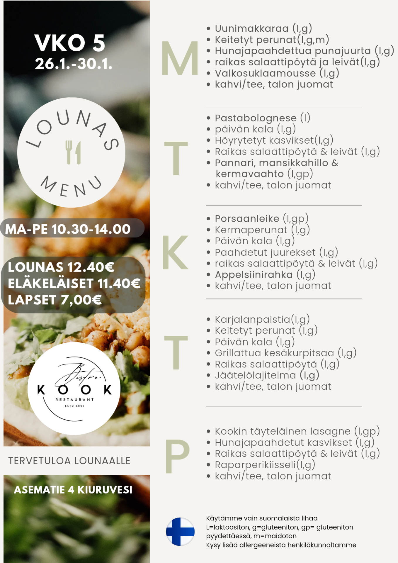Hintamme ovat keskitasoa ja vaihtelevat ruokalajin mukaan. Lounas tarjotaan arkisin 10:30-14:00 hintaan 12,40€. Eläkeläisille hintaan 11,40€ ja lapset alle 12v 7,00€.